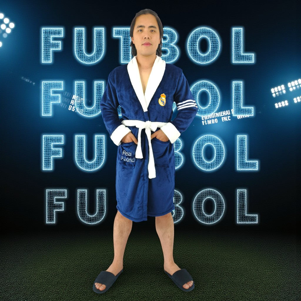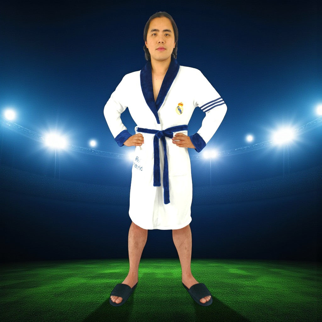 Bata levantadora equipo Real Madrid C.F. con cordón y dos bolsillo para hombre, cómodas para descansar en casa después de un arduo día de trabajo, la puedes usar mientras lees, disfrutas de una película, un café, entre otras actividades, son ideales para las noches y mañanas frías.